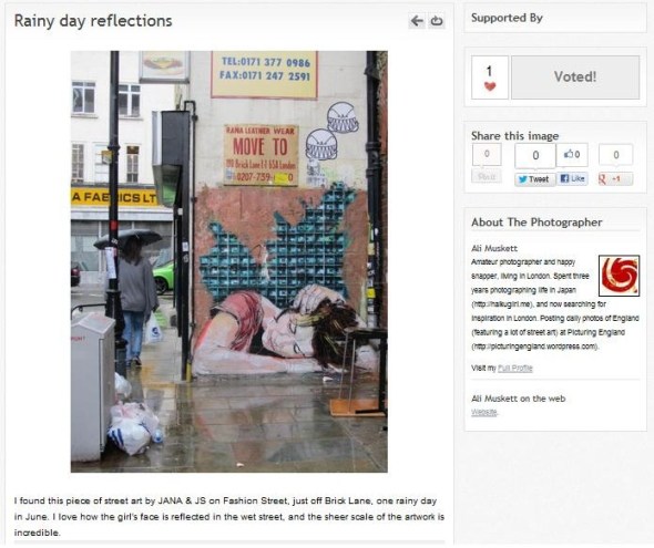 Posted: August 23, 2012 Filed under: Art & Street Art, London, Photography | Tags: brick lane, JANA & JS, london, photography, postaday, postaweek2012, rain, street art, world photography day 2 CommentsI’ve been jostled into entering another photography competition (my third one this year), and would be delighted if you would all consider voting for my entry.